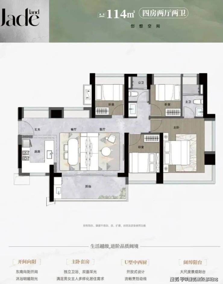 114平㎡的4房2厅2卫,设计的是横厅南北通透格局,进门入户玄关,LDKB一体化,五开间朝南,全屋9面飘窗,主卧大套间,U型厨房,卫生间干湿式分离,得房率约92%(包含赠送),阳台主朝东南向。