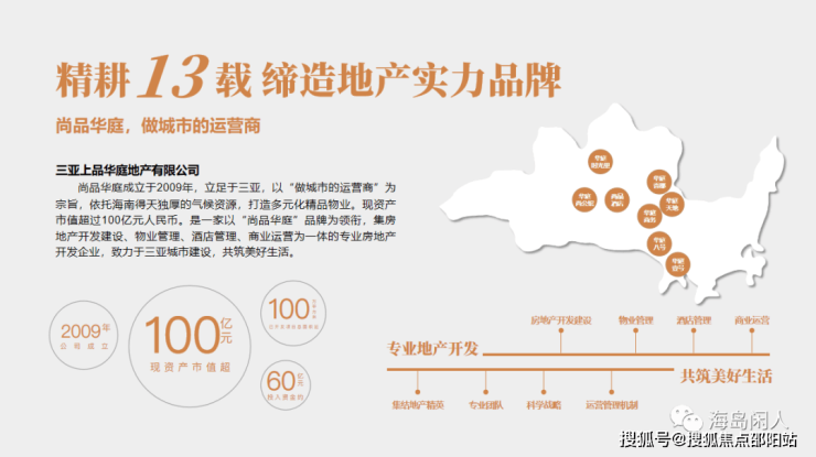三亚上品华庭地产有限公司成立于2009年,公司实际投入资金约60亿元人民币,现资产市值超过100亿元人民币,已开发项目总面积近百万方。公司以“尚品华庭”品牌为领衔,集房地产开发建设、物业管理、酒店管理、商业运营为一体的专业房地产开发企业。