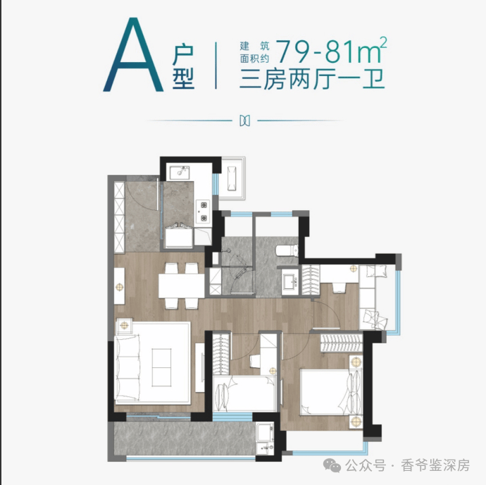 A户型:建面约79-81㎡三房两厅一卫