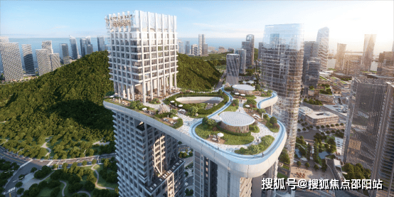 垂直方向,三座塔楼是主角:两座150 米的住宅,一座融合办公与酒店的200 米主塔;独特的是 150 米高空“生态连廊”,将三座建筑紧密相连,里面藏着空中花园、荧光跑道,傍晚在高空跑道跑步,一边是璀璨的城市灯火,一边是清新的自然海风。此外,二到五层架空的绿化停车库,既减少地下车库的开挖,层层出挑的造型也在有限的覆盖率下,为居民提供一个尽可能广阔的私家花园。