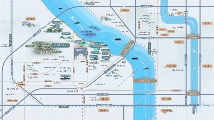 鸿升春江明月位于粤港澳大湾区鹤山市古劳水乡,项目北面望一线西江江景,与佛山市一江之隔,南侧及西侧为古劳水乡,坐落鹤山东部新城和生态文旅产业带,周边拥有自然景观资源和商业配套。