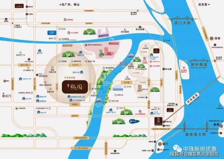 ◎ 项目择址于中山主城区——石岐区、西区交汇核芯地段,天悦城、兴中商圈、利和商圈、大信商圈四大商圈环绕,购物、娱乐、休闲、就餐一应俱全,全龄都会繁盛生活配套举步可享。紧邻中山母亲河——岐江河,处在 “岐江夜游”关键河段,拥览“一河两岸三个灯光秀四个码头五个市民广场六座大桥九支火树银花十个主题公园”的绝美景观,乘船夜赏岐江,看波光流影,享受景随灯动的美好情境。狮山公园、岐江公园、中山公园三大公园环绕,于此坐享滨水景观长廊鲜氧生态。