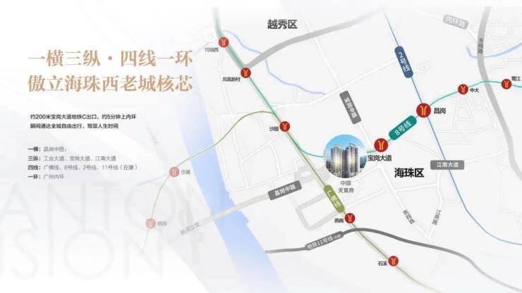 距地铁8号线宝岗大道C出口站约200米,5min上内环,交通便利,全城通达性高;步行500米即达省级名校昌岗中路小学,临近乐峰广场、太古仓、南方医科大学珠江医院等成熟生活配套。