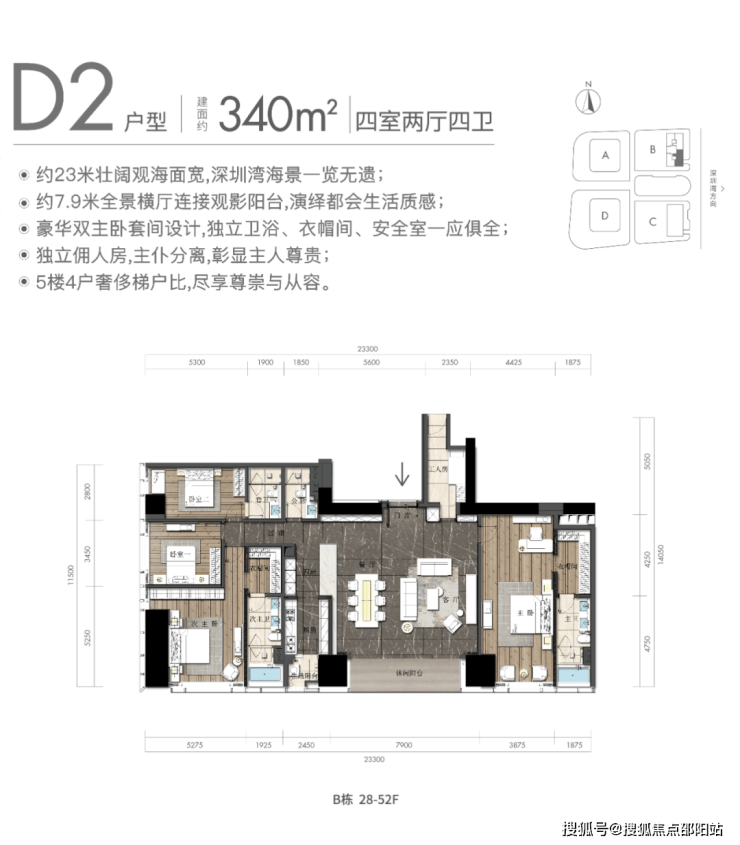 观景阳台:高区340平米户型,东面23米宽无敌海景视野(塔楼总观景面约46米)