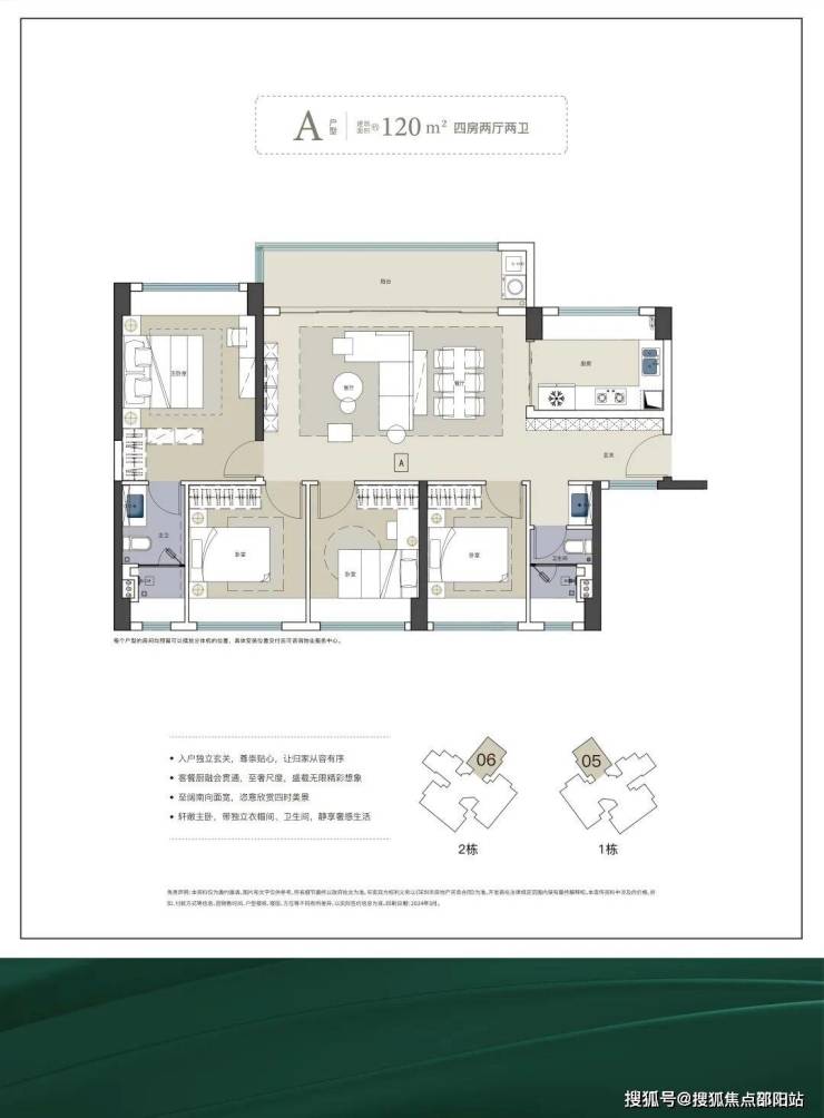 115㎡四房两卫:总价518万起,楼王级配置。横厅设计,客餐厅开间6.2米,南北双阳台,主卧20㎡套房带独立衣帽间,得房率80%。