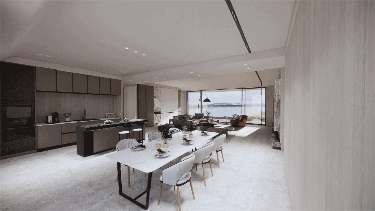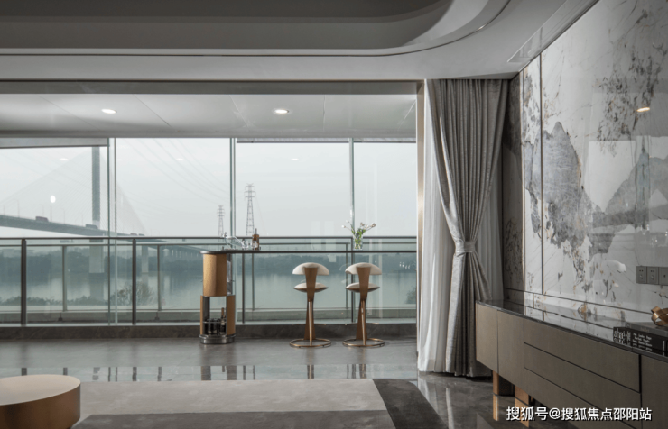 它把餐客厅完完全全包裹,几乎没有保留地将江景引入了室内,直接带业主解锁“裸眼3D观江新体验”。