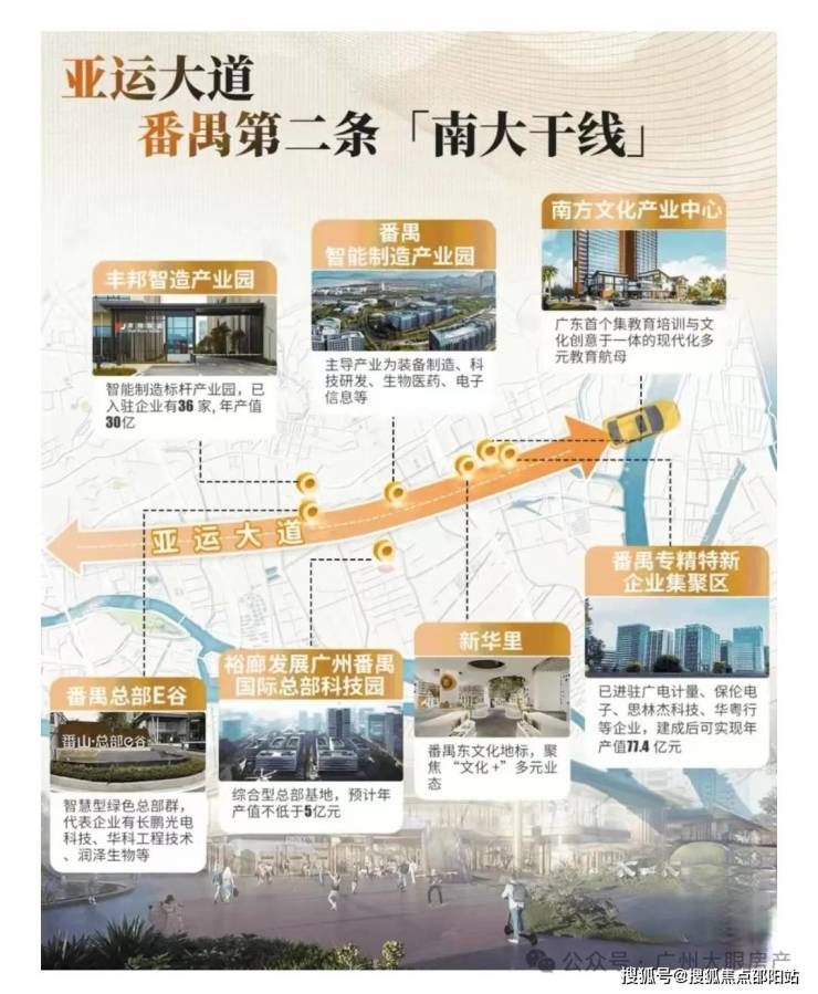值得注意的是,以番禺广场商圈为起点,连通到莲花湾汽车产业带,“第二条南大干线”千亿产业轴已在酝酿。亚运大道沿线,密布番禺总部E谷、智能制造产业园、丰邦智造产业园等节点,这里将是番禺的“智核”所在,也是番禺未来所在