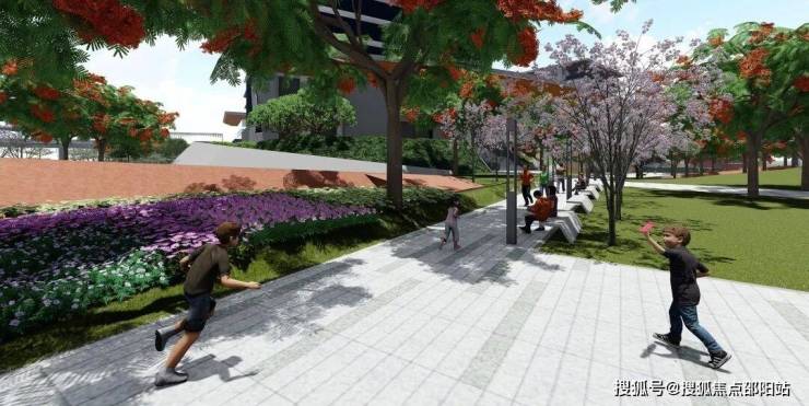方案将原设计的大量硬质铺地更改为乔木花园,为往来行人增添骄阳下的庇护。 选用了数百颗观花乔木——广州樱、凤凰木、大腹木棉、紫花风铃木、蓝花楹——春夏秋冬,红粉蓝绿……