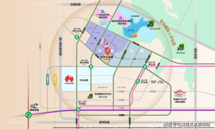高精尖圈层聚落:毗邻华为总部基地,周边吸引了康冠、神舟等众多知名企业,培育了逾600家高新技术企业。作为全球第三大万亿级电子信息产业集群承载区,这里汇聚了庞大的高素质精英人群,区域发展前景较为广阔。