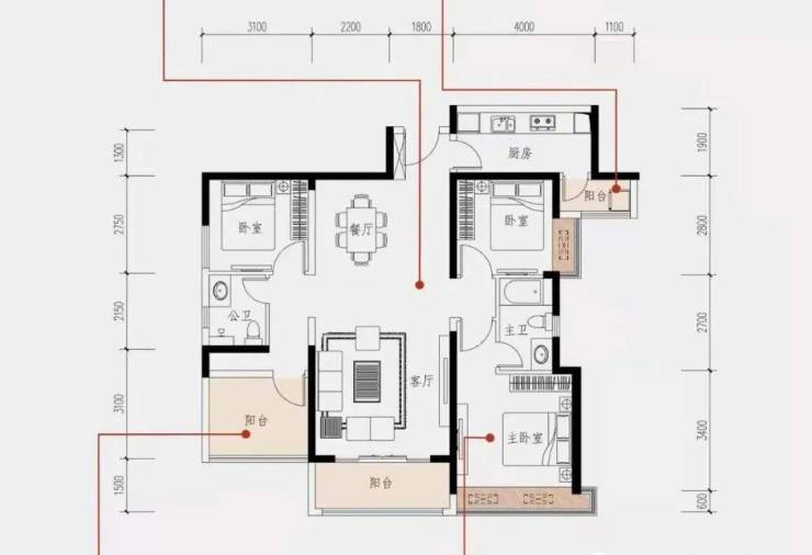 A户型:约117㎡ 4房2厅2卫 亮点:餐客厅双阳台 奢阔主卧