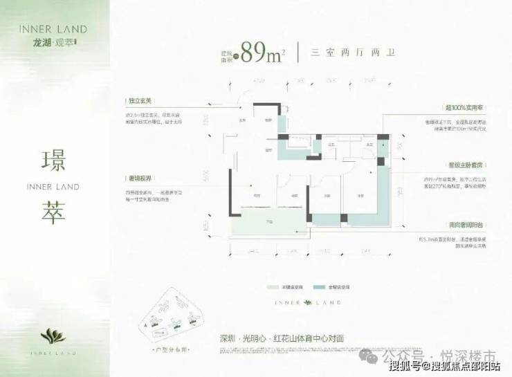 项目核心走量款,是光明刚需优选户型,打破小面积户型局限,89㎡实现标准三房两卫,适配年轻刚需、新婚夫妇及三口之家。