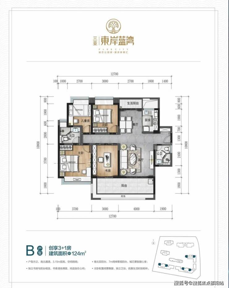 ▼B户型:建面约124㎡创享3+1房
