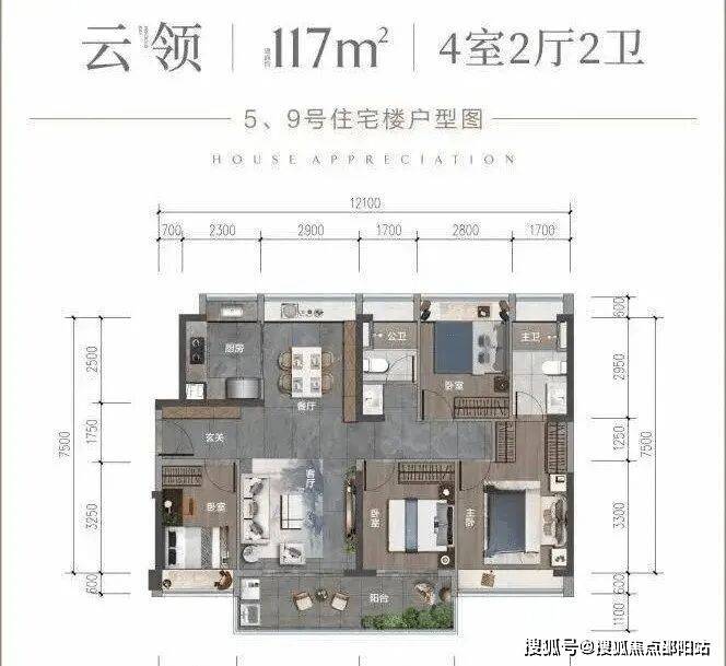 建面约117㎡四房,采光面和景观面约12m,270°朗阔阳台,四季景致肆意入宅,厨房-客餐厅-阳台一体设计,流畅动线充盈全家幸福尺度,生活井然有序,是二胎家庭的优选。