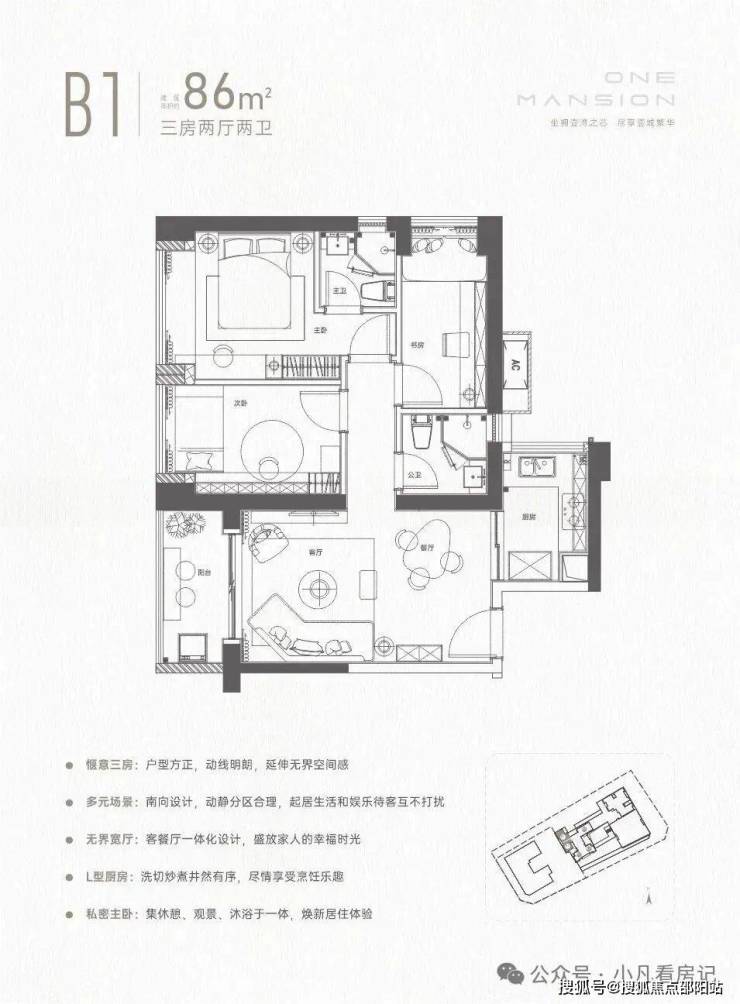 设计的经典竖厅格局,客厅3.6米开间,餐客厅一体化设计三开间朝南,3个卧室分别做到了3.3米/2.9米/2.7米的宽度,L型厨房,得房率72.47%(不含赠送),东南朝向。