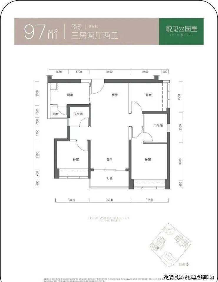 97㎡的3房2厅2卫,仅3栋4单元01户型,设计的是竖厅双龙抱珠格局,客厅3.4米开间,三开间朝南,3个卧室分别做到了3.2米/2.8米/255米的宽度,L型厨房带1个生活阳台,公卫三段式分离,得房率73.61%(不含赠送),东南朝向。
