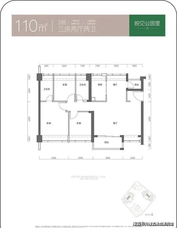 110㎡的3房2厅2卫,设计的是横厅大开间格局,客厅5.8米开间,南北通透双阳台,三开间朝南,3个卧室分别做到了3.4米/2.9米/2.6米的宽度,U型厨房,公卫三段式分离,得房率73.71%(不含赠送),阳台主朝西南或东南向。