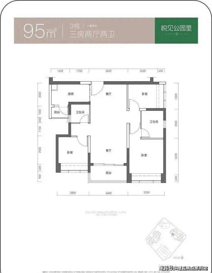 95㎡的3房2厅2卫,仅3栋1单元01户型,设计的是竖厅双龙抱珠格局,客厅3.4米开间,三开间朝南,3个卧室分别做到了3.2米/2.8米/2.3米的宽度,L型厨房带1个生活阳台,公卫三段式分离,得房率73.71%(不含赠送),西南朝向。