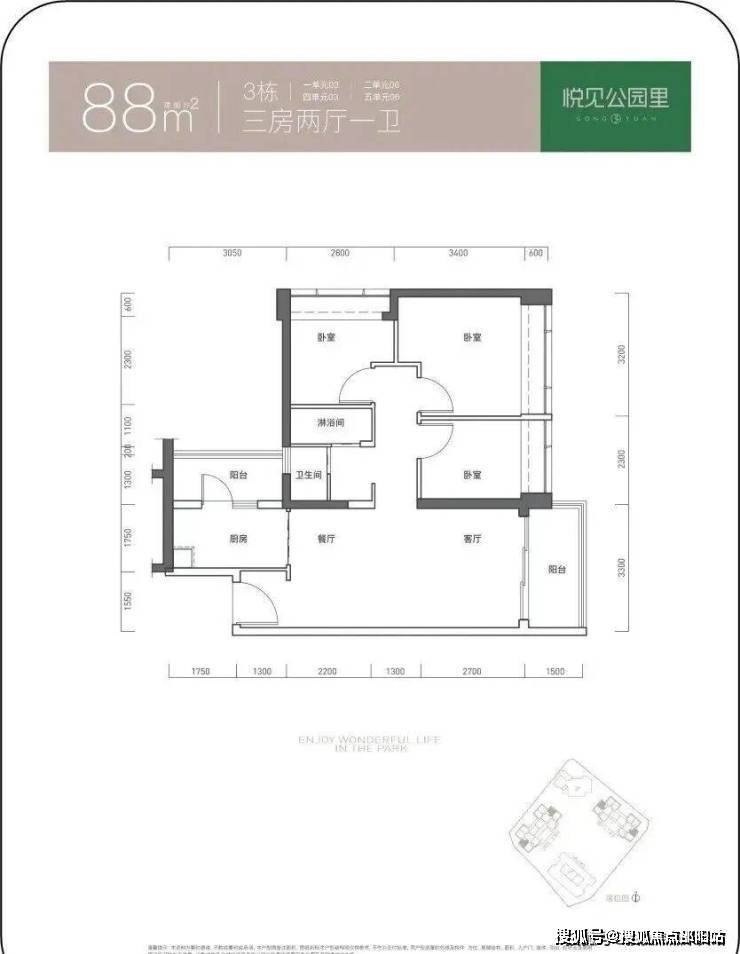 88㎡的3房2厅1卫,设计的是经典竖厅格局,客厅3.3米开间,LDKB一体化设计,动静分区,3个卧室分别做到了3.2米/2.8米/2.3米的宽度,L型厨房带1个生活阳台,公卫三段式分离,得房率73.71%(不含赠送),有西北、东北、西南或东南朝向。