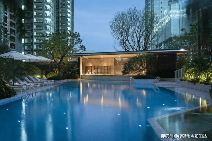 更震撼的是,社区既有成人泳池、儿童戏水池以及度假会客厅,还设置了躺椅、凉亭、水吧台等,度假风拉满。