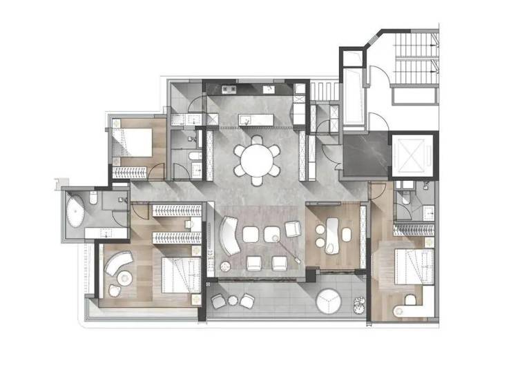 将自然引入室内,贴合人体习惯的健康科技,在空间上优化人际关系,实现身体和心灵双重满足,构筑家庭、邻里、圈层共融。
