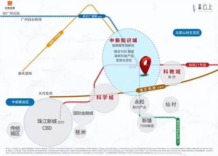 金地云上位于广州·增城·知识城南·21号线中新地铁站旁,1站黄埔3站可达天河(快线),占据知识城南核心位置,地处科学城、知识城、科教城、增城区国家经济开发区等4个重点规划区的交汇处,是集商业、教育、居住、生态环境等各方面配套于一体的品质社区。
