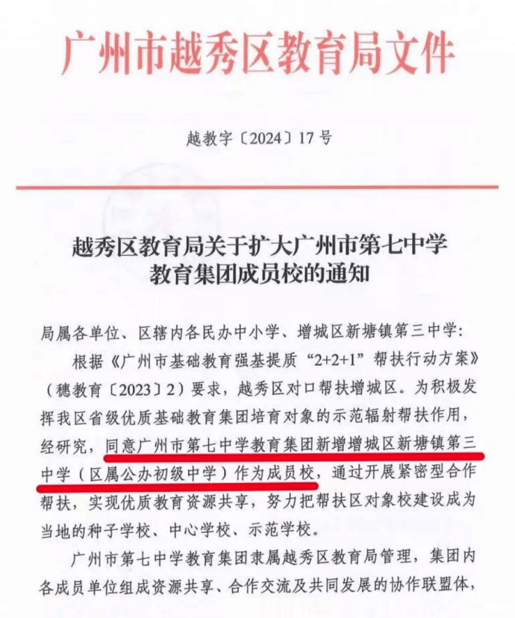 而且,对口的新塘三中加入了增城广附教育集团 ,与增城广附实行同教材、同教研、同考试的管理模式。同时,还有广州七中集团的合作帮扶,教育质量有保障。