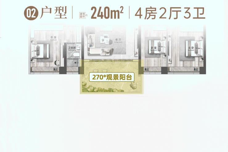 这个240㎡大平层,被打开的视角广度与纵深感,都是极限设计——约6.45米长、3.6米深、270°视野的IMAX级瞰景阳台。