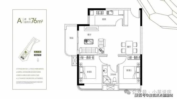 建筑面积约76-78㎡2房+1卫(灵活多变+1多功能空间)