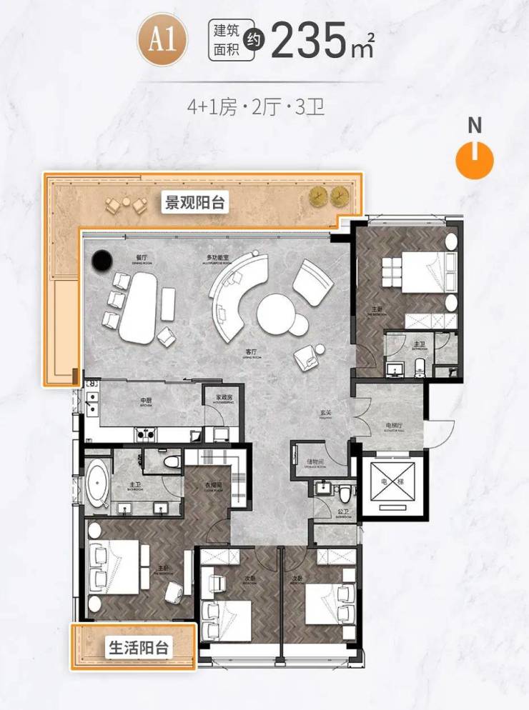 此外,项目还有升级版的建面约235㎡四房产品,超50m大横厅搭配约19米转角瞰江阳台,既使得江景将于三面跃入眼帘,又拉伸了室内宽阔的空间感,彰显非凡的尺度。