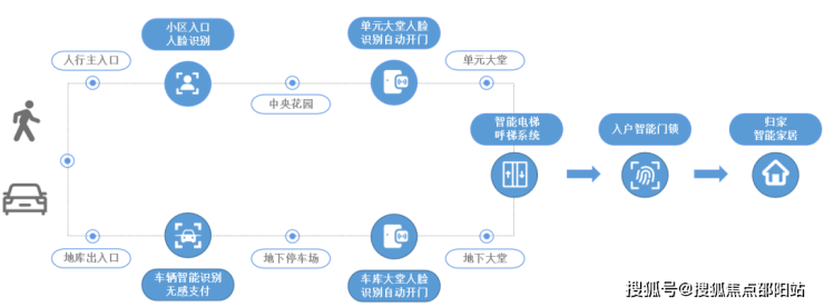业主可以通过人脸识别、二维码进入社区大堂,楼栋大堂入口可视对讲门口机联动呼梯,业主电梯内三合一梯控系统可实现人脸识别/刷卡/二维码/NFC开启点亮楼层;访客通过保利和院APP预约,业主确认访客信息,后续访客进入社区内通行流程与业主一致。全区可实现无感通行,呈现智能科技感,使业主便携归家。