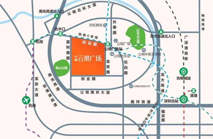 双地铁上盖综合体:6号线/13号线(规划中)公明广场站联通地下商业,6号线已通车;周边地铁18、29号线规划中,南光、龙大双高速免费通行,便捷通达南山、福田中心;广深港高铁已投入使用,30分钟速达香港西九龙,赣深高铁的建设,实现粤港澳大湾区半小时生活圈。