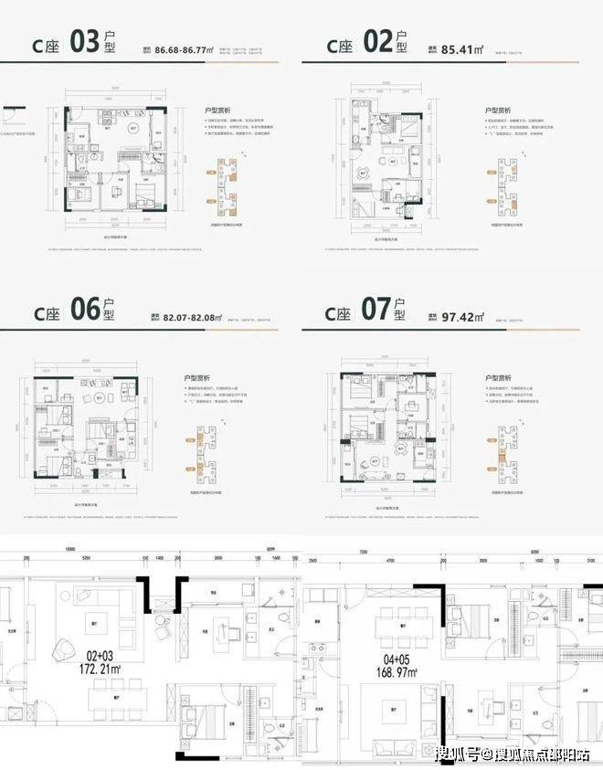君成世界湾总建面约56.65万㎡,容积率4.68,绿化率30%,规划为集公寓、商业、酒店于一体的大型综合体。主力户型涵盖82-172㎡,主打82-97㎡三房、169-172㎡四房及4+1房,户型方正通透,通燃气带阳台,4.5米奢阔层高,空间利用率出色,毛坯交付,可额外选择精装,适配刚需自住与轻资产配置。