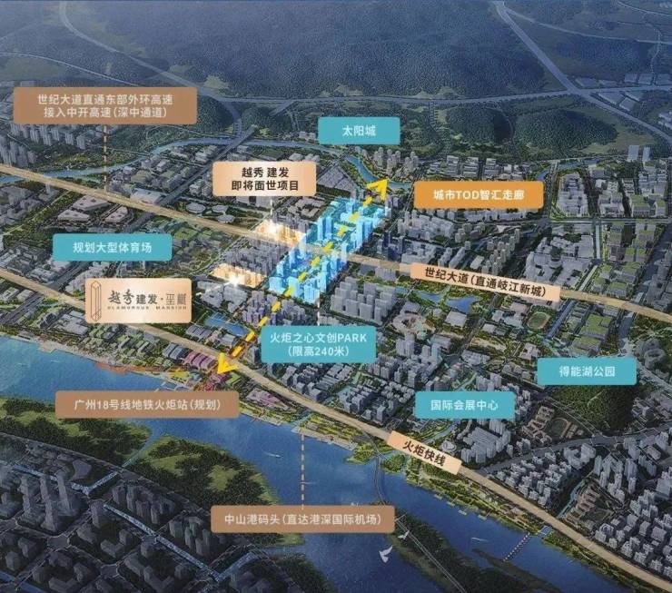 板块定位"城市TOD智汇走廊",规划240米地标群、19万㎡综合体"火炬之心文创PARK",未来将成中山城市新封面。