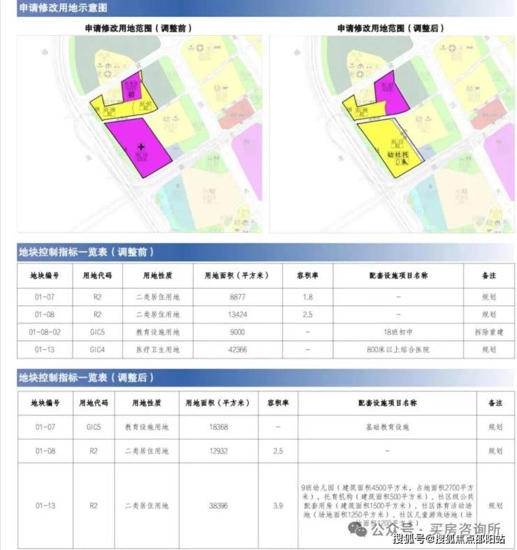 01-13地块用地面积由42366平方米调整为38396平方米,用地性质由医疗卫生用地(GIC4)调整为二类居住用地(R2),容积率由“-”调整为“3.9”,配套项目名称由“800床以上综合医院”调整为“9班幼儿园(占地面积2700平方米,建筑面积4500平方米),托育机构(建筑面积500平方米)、社区级公共配套用房(建筑面积1500平方米)、社区体育活动场地(场地面积1250平方米)、社区儿童游戏场地(场地面积1200平方米)”,备注“规划”其中1-13也是现在即将土拍的A815-0036地块