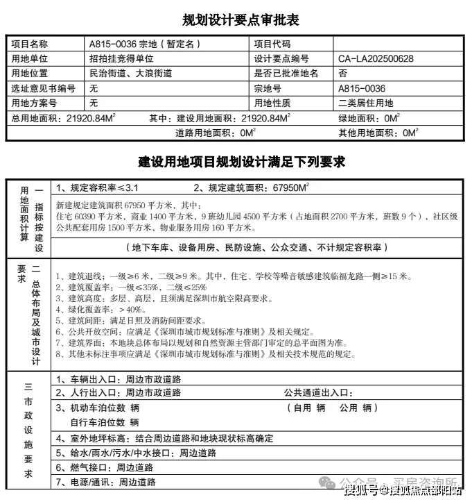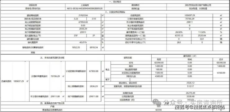 用地面积21920.84㎡,建筑面积67950㎡,容积率3.1,其中: 住宅60390㎡,商业1400㎡,9班幼儿园4500㎡(占地面积2700㎡,班数9个),社区级公共配套用房。