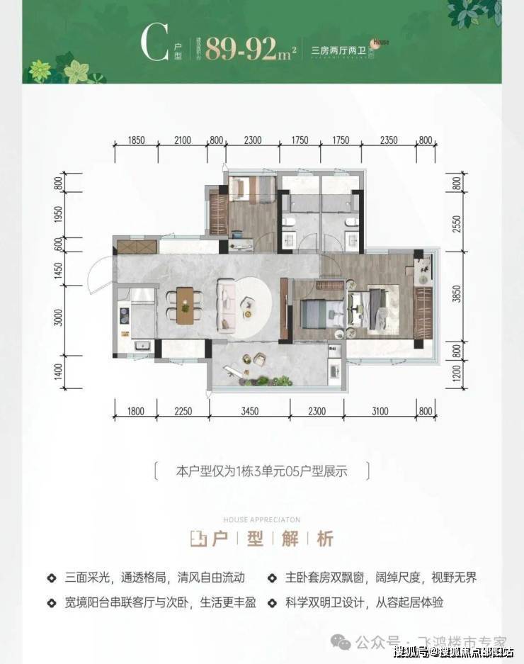 招商会展湾雍境名邸位于宝安沙井大前海会展湾片区的招商会展湾雍境名邸,本次是招商会展湾雍境二期,首推1栋3单元的195套房源,面积段有80㎡3房1卫,91㎡3房2卫,92㎡3房2卫3种户型,是3梯7户的普通高层,预计2027年9月精装交楼。