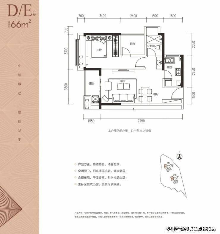 户型点评:均为朝南方位,户型整体方正实用,功能布局合理;两个卧室均带有飘窗,便于采光通风,阳台空间可灵动改做次卧或书房,整体利用率较高。