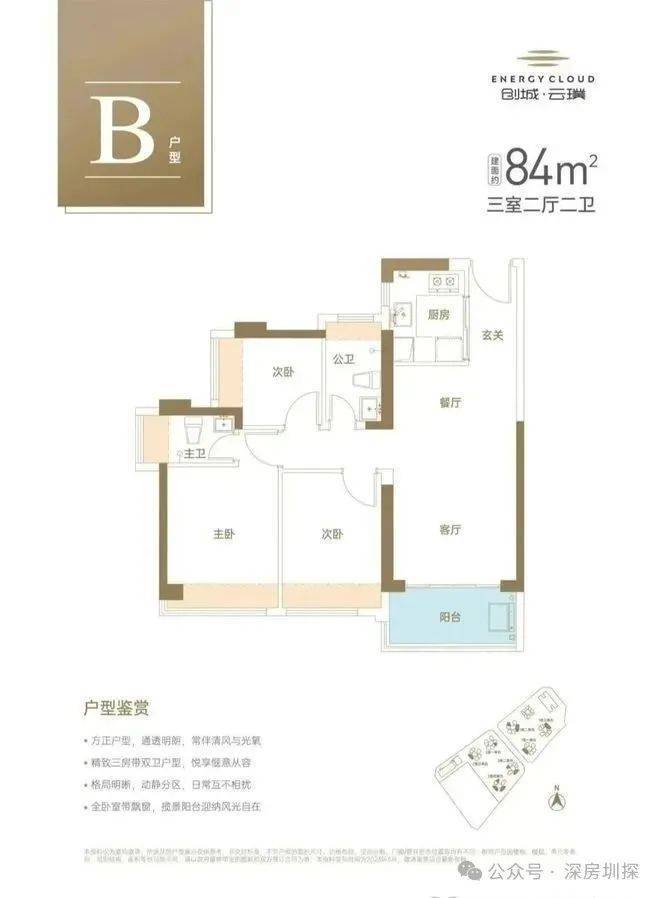 -84㎡3房2厅2卫:设计的是竖厅格局,LDKB一体化设计,客厅3.4米开间,U型厨房,卫生间干湿分离,阳台有正东、西北、东北、东南、西南朝向。