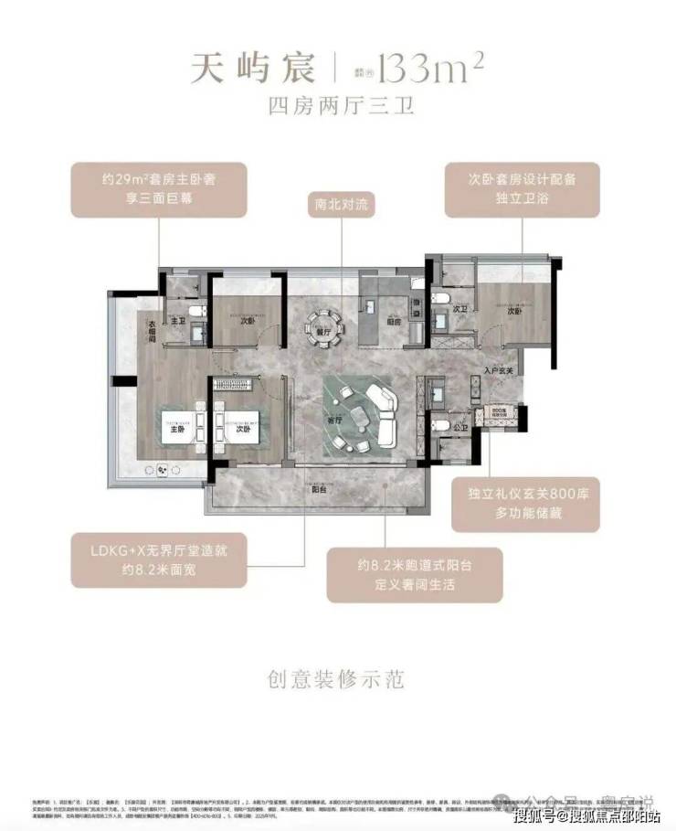 133㎡的4房2厅2卫,设计的是竖厅南北通透格局,进门入户玄关,客厅5.4米开间,餐客厅分离设计,客厅连接次卧出12.3m²的观景大阳台,L型中式+岛台灵动式厨房,公卫三段式干湿分离,得房率约78.27%(不含赠送),阳台主朝东南或西南向。靓点:超大客餐厅南北对流+8.2米长超大观景南向阳台,超大主卧+270°无柱转角飘窗