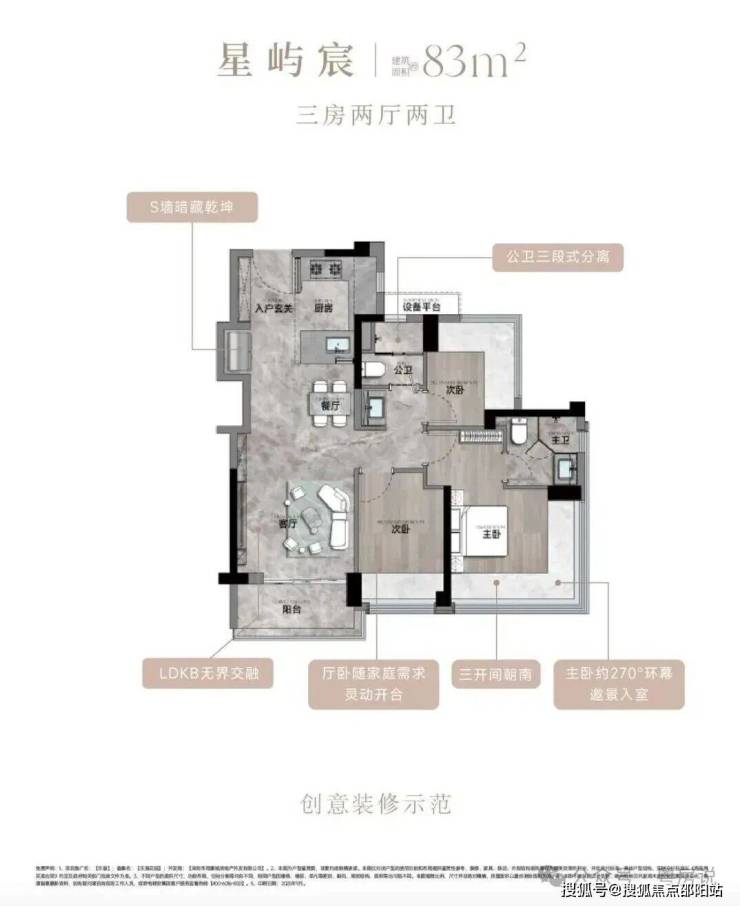 83㎡的3房2厅2卫,设计的是经典竖厅格局,客厅3.35米开间,LDKB一体化,S墙设计预留双开门冰箱卡槽位,三开间朝南,动静分区,U型厨房,公卫三段式干湿分离,赠送1.98平设备平台,得房率约77.15%(不含赠送),阳台5.02m²西南或东南朝向。靓点:83平做到了3房2卫,主卧270°无柱转角飘窗,厨房烟道外置+额外赠送设备平台,并且是纯南向格局。