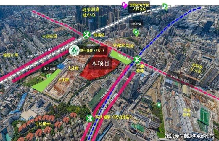 深圳国润片区城市更新项目(中交·国润华府)处于深圳市龙华区民治街道工业路与中华路交叉处东南侧,距离壹方天地商圈300米,位于龙华超级商圈范围内,紧邻工业路城市横向发展轴,周边油福、油松地铁站和深大城际民治北站正在建设中。