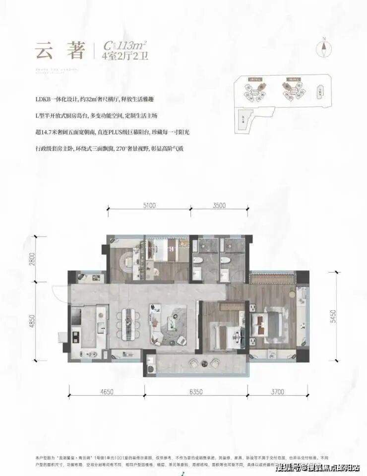 113㎡的4房2厅2卫,设计的是横厅格局,带1个6.35米长的大阳台,南北通透户型。