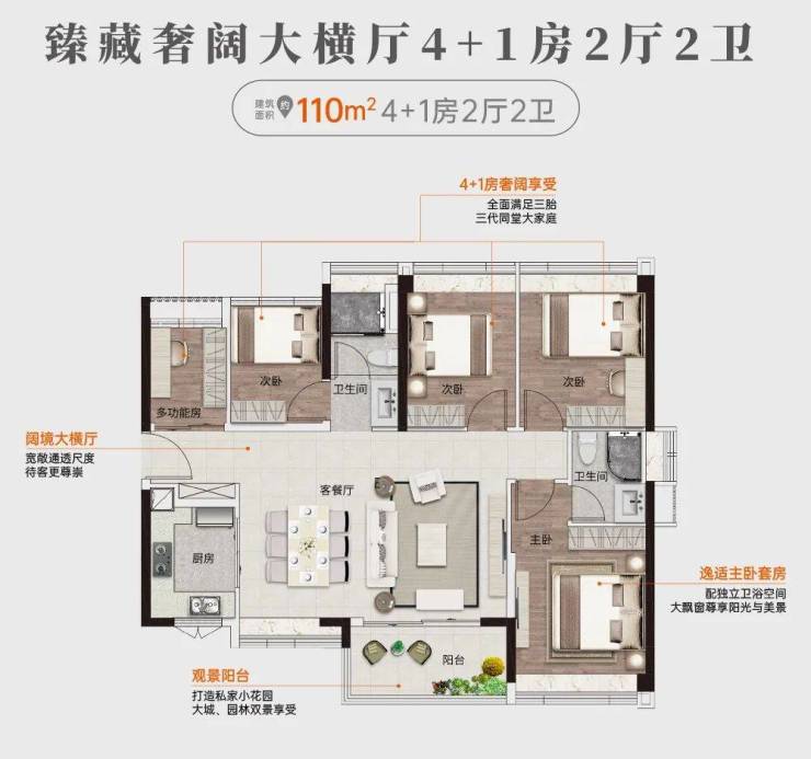 约110㎡大横厅奢阔空间,感受豪宅的尊贵尺度。全南向独立单边位,阳光清风常作伴,居住体验舒适安宁。敞阔五居的格局下,三代同堂大家庭无压力,也少去了换房苦恼。