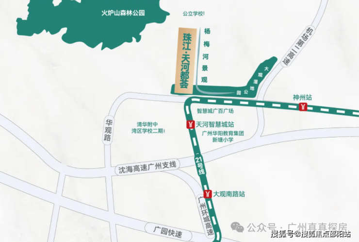 项目距离天河智慧城地铁站,约600米(直线距离,百度测距),可搭乘21号线,3站金融城,地铁优势明显。