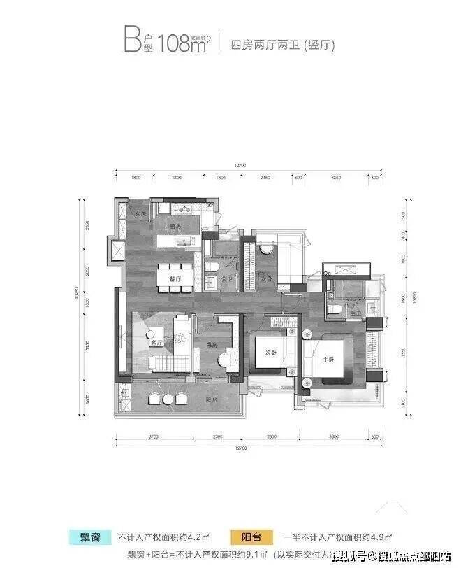 建筑面积约108㎡户型-4房2卫(竖厅)