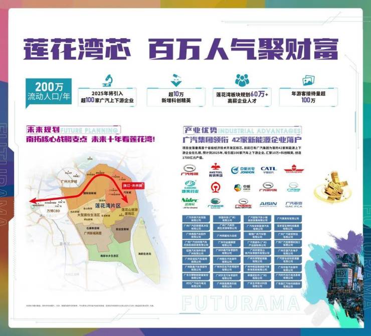 项目位于千亿汽车城板块核芯:周边以广汽集团领衔,已有42家新能源企业落户,2025年将超100家,汇聚10万+科创精英,60万+高薪企业人才。