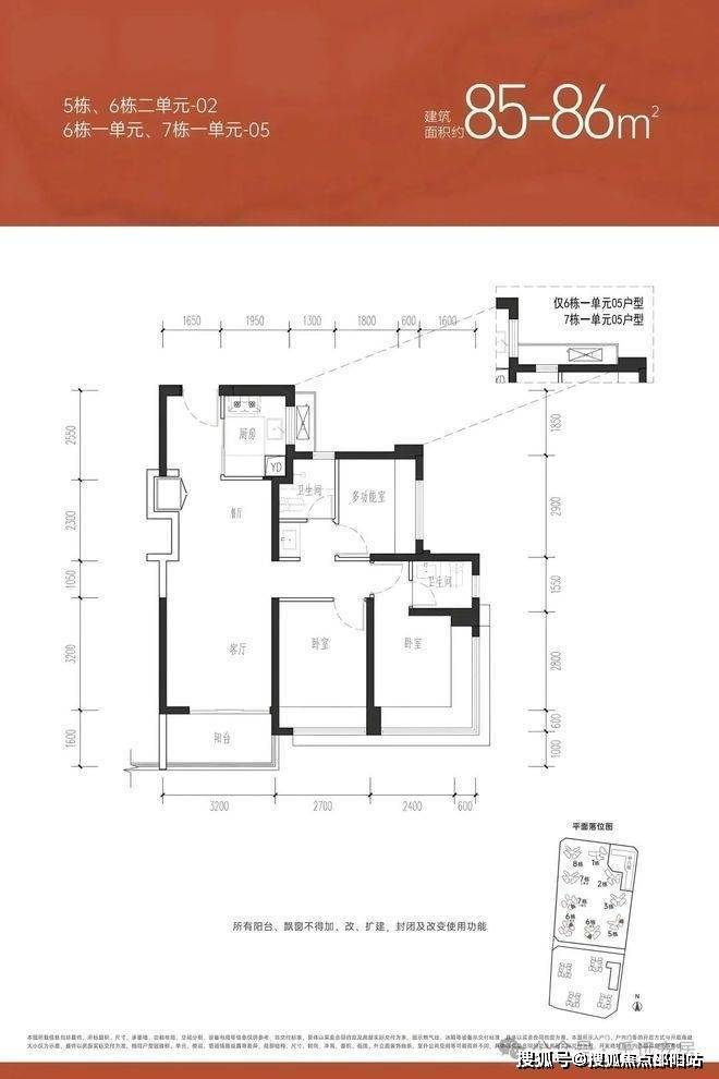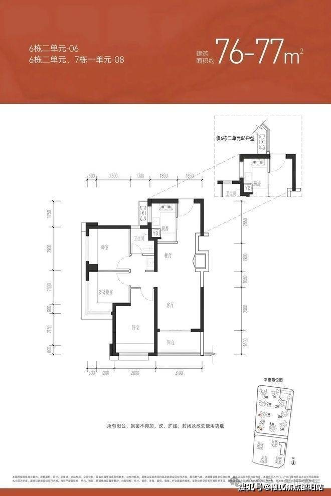 【约76㎡三房一卫】户型分布:只分布在6栋2单元和7栋1单元,共258套