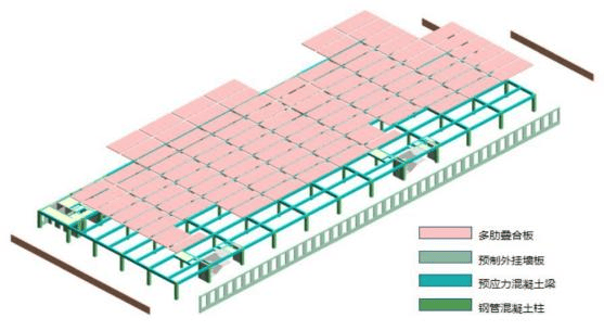 采用自主创新研发的“工业上楼 ”智能建造建筑产品 PCRC 体系。主体采用薄壁高强钢管混凝土柱+先张法预应力梁+普通钢筋砼叠合梁+多肋叠合楼板组成的新型建筑工业化结构。实现了100%工厂预制、100%现场装配,免模板、免支撑、免外架,现浇砼不占施工关键线路,可穿插施工效率高等优势。