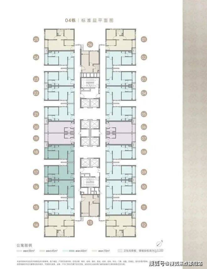 住宅由4栋48层建筑组成,分别是1栋、2栋1/2单元和3栋,3梯5/6户,4栋是商务公寓45F(1470户),5栋是幼儿园。