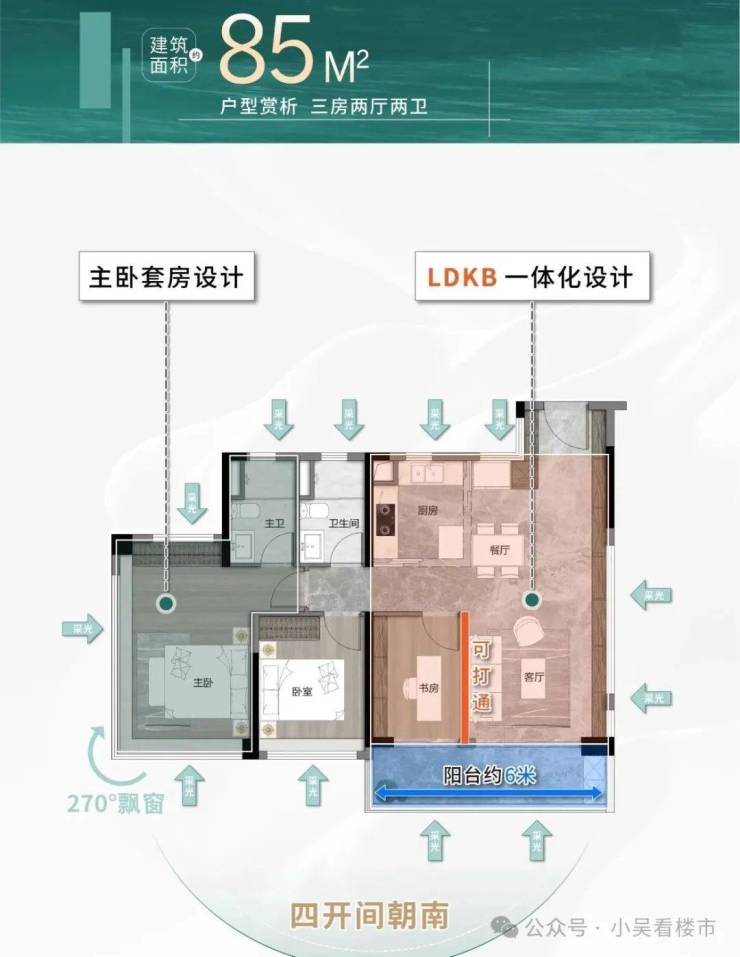 建面85平三房两卫,阳台长6米,入户处一整面的飘窗位,还可打通连通阳台的次卧做出大方厅,总价358-400万左右。